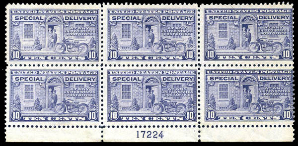 Special Delivery, 1922, 10¢ gray violet (Scott E12), plate block of 6, o.g., 2 stamps with hinge remnant, 4 stamps never hinged, Fine. Scott $525.