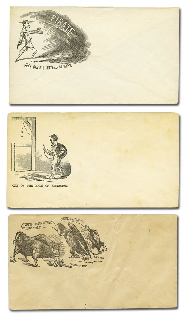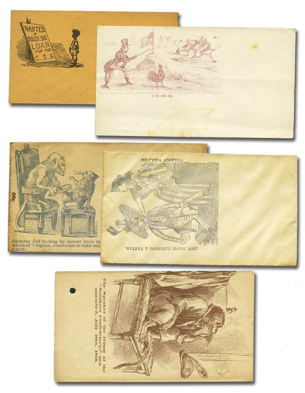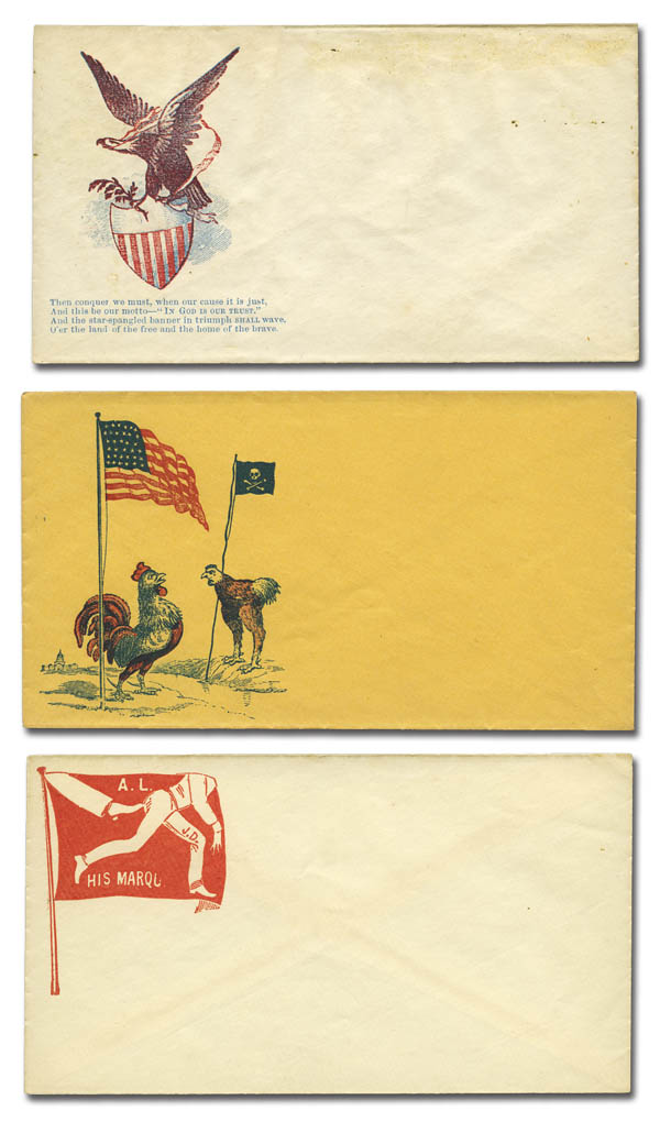Lot 363![]() c. 1861, Civil War patriotic covers, a selection of 17 different unused designs, including Magnus, various multicolor including some hand-drawn, caricatures and more. A couple with minor flaws (mainly on the reverse), otherwise mostly Very Fine, a premium lot of attractive better designs. Estimate $200 - 300. |