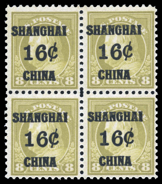 Offices in China, 1919, 16¢ on 8¢ olive bister (Scott K8), block of 4, fresh, o.g., lightly hinged at top, never hinged at bottom, Fine to Very Fine. Scott $470.