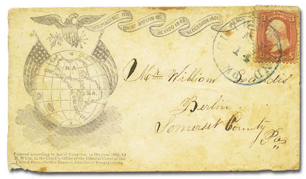 Lot 364![]() c. 1861, Civil War patriotic cover: Eagle, Flags and Globe (Walcott L-2422. Weiss E-R-231), an intricate and unusual design on a cover to Vermont, with an indistinct Maryland town cancel tying a 3¢ (#65); some soiling, Fine overall. Estimate $100 - 150. |