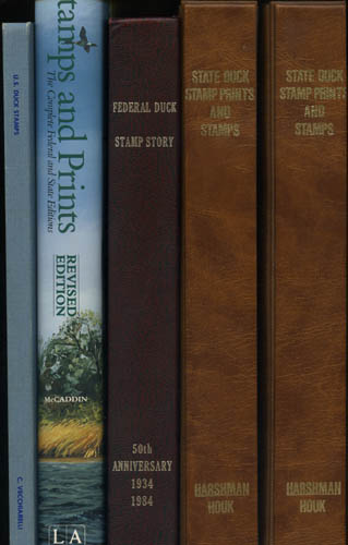 Lot 366![]() Vecchiarelli, Carlo F., U.S. Duck Stamps, 1979, hardbound limited edition #245/5000 and signed by the author, 104 pages with black and white illustrations; plus Federal Duck Stamp Story, 1984, hardbound, 365 pages with black and white illustrations; and two lovely coffee table books - the first 1987 and the revised 1991 Duck Stamps and Prints: The Complete Federal and State Editions with 192 pages and 276 pages both with color illustrations; a great set of 5 books for the Duck specialist. Shipping weight 16.75 lbs / 7.6 kilos. Estimate $50 - 75. |