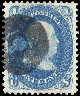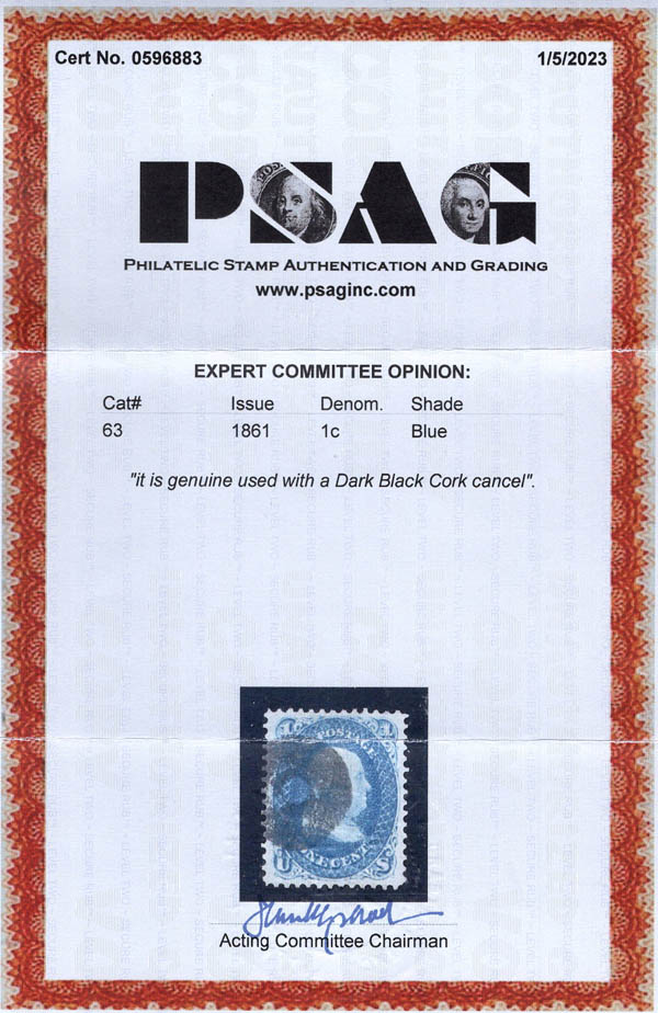 1861, 1¢ Franklin, blue (Scott 63), incredibly well centered, with an unusual cork cancel, Extremely Fine, with 2023 P.S.A.G. certificate. Scott $45.