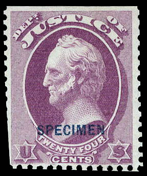 Justice Dept., 1875 Special Printing, 24¢ purple, overprinted "Specimen" (Scott O32SD), usual scissor cut perfs, without gum as issued, Fine to Very Fine for the issue. Scott $1,250.