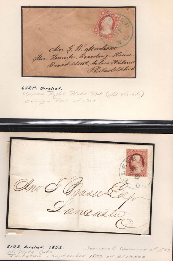 Lot 37![]() 1852, 3¢ Washington, dull red, type I (Scott 11 vars.), a group of 4 covers, each plated, the actual colors being orange red (1) and brownish carmine (3), Fine to Very Fine. Scott $99. Estimate $50 - 75. |