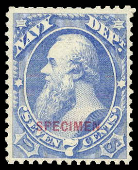 Navy Dept., 1875 Special Printing, 7¢ ultramarine, overprinted "Specimen" (Scott O39SD), without gum as issued, Very Fine for the issue. Scott $550.