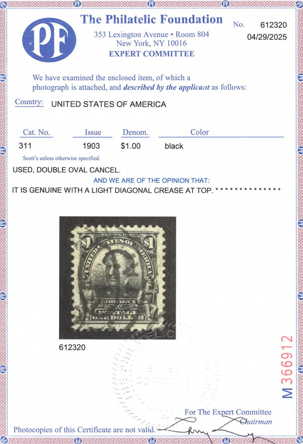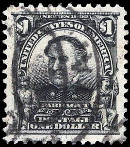 Lot 371 o 1903, $1 Farragut, black (Scott 311), beautifully well centered, with a neat double oval cancel; light diagonal crease at top, otherwise Extremely Fine, with 2025 P.F. certificate graded XF 90. Scott $90. Estimate $60 - 80. |