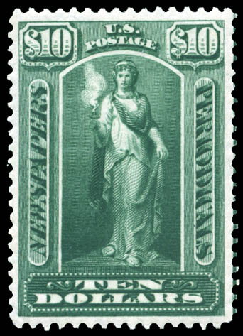 Newspaper, 1896, $10 green (Scott PR122), a perfectly centered beauty, o.g., never hinged, Extremely Fine and choice. Scott $105.