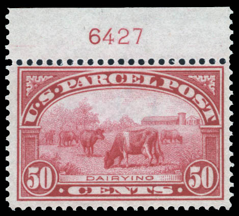 Parcel Post, 1913, 50¢ carmine rose (Scott Q10), plate number single, nicely centered and very fresh, o.g., lightly hinged, with some offset on gum, almost Very Fine. Scott $220.