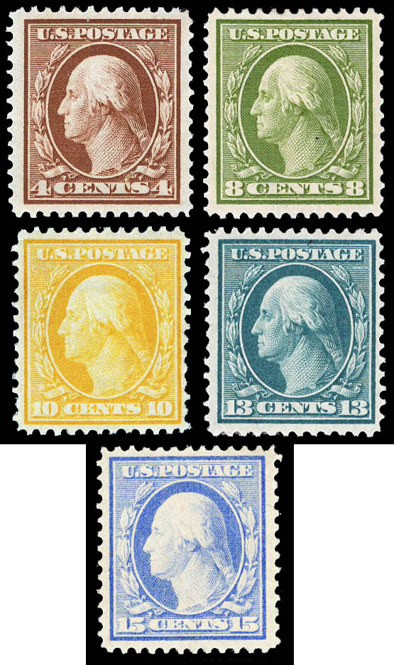Lot 384![]() 1908, 4¢, 8¢, 10¢, 13¢ and 15¢ Washington, D.L. watermark (Scott 334, 337-340), a fresh and attractive group of 5, o.g., mostly lightly hinged, 4¢ is Extremely Fine, 8¢ is Very Fine, others are F.-V.F. Scott $256. Estimate $80 - 120. |