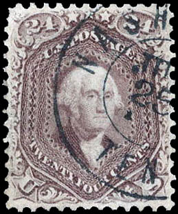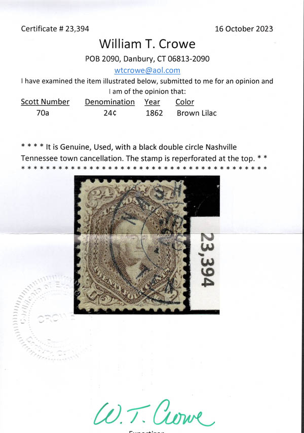 Lot 384 o 1862, 24¢ Washington, brown lilac (Scott 70a), excellent centering and bright fresh color, black double circle Nashville, Tennessee cancellation; reperfed at top, otherwise Very Fine to Extremely Fine, a beautiful stamp, with 2023 Crowe certificate. Scott $325. Estimate $150 - 200. |