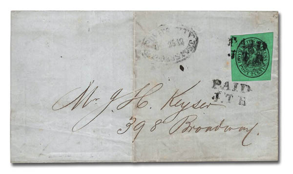 Lot 389![]() Boyd's City Express, 1854, 2¢ black on green (Scott 20L10), a beautiful example with large margins all around, tied by PAID/J.T.B. on an 1854 folded cover, with 2nd strike of the handstamp and partial Boyd's date stamp at left, Very Fine, with 2019 P.F. certificate. Scott $200. Estimate $250 - 350. |