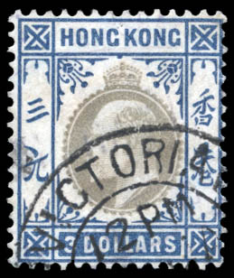 Lot 39 o Hong Kong, 1903, King Edward VII, $3 slate & dull blue (Scott 83), Crown CA watermark, neat Victoria c.d.s., Fine used, a lovely example of this high value. Scott $400. SG 74; £425 ($500). Yang 73. Estimate $120 - 150. |