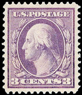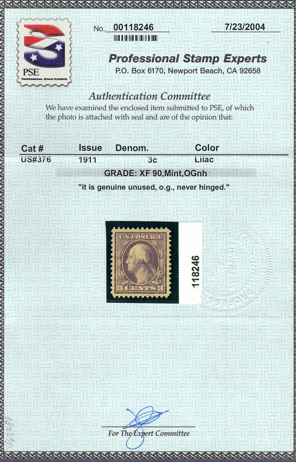 1911, 3¢ Washington, type I, deep violet, S.L. watermark (Scott 376), o.g., never hinged, Extremely Fine, with 2004 P.S.E. certificate graded XF 90. Scott $40. SMQ $95.