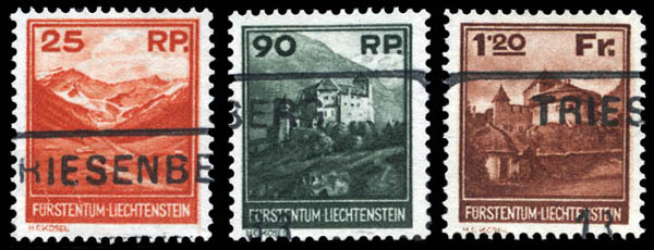 Liechtenstein, 1933, Landscapes, 25rp to 1.20fr complete (Scott 108-110), Triesenberg cancels, Very Fine. Scott $493. Michel 119-121. Zumstein 98-100; 475 SFr ($520).
