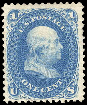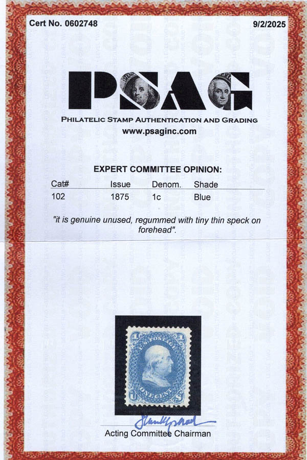 Lot 425 ( )1861-66 (1875 Re-issue), 1¢ Franklin, blue (Scott 102), regummed; tiny thin speck on forehead, otherwise Fine to Very Fine, with 2025 P.S.A.G. certificate, only 3195 sold. Scott $350. Estimate $100 - 150. |