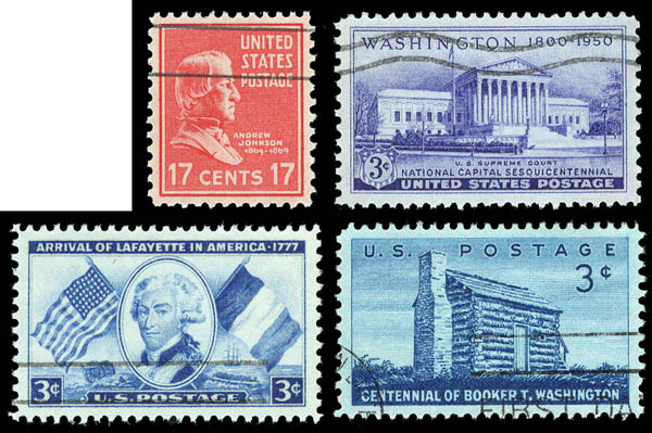 Lot 434 o 1938-56, a group of 4 GEM 100's (Scott 822//1074), including Sc. #1010 which has an SMQ value of $275 for a 98; the other three (#822, 991 and 1074) are unpriced in SMQ, a great opportunity to acquire some wonderful gems, each with neat machine cancels, Superb, all with 2024 P.F. certificates graded GEM 100. Estimate $200 - 300. |