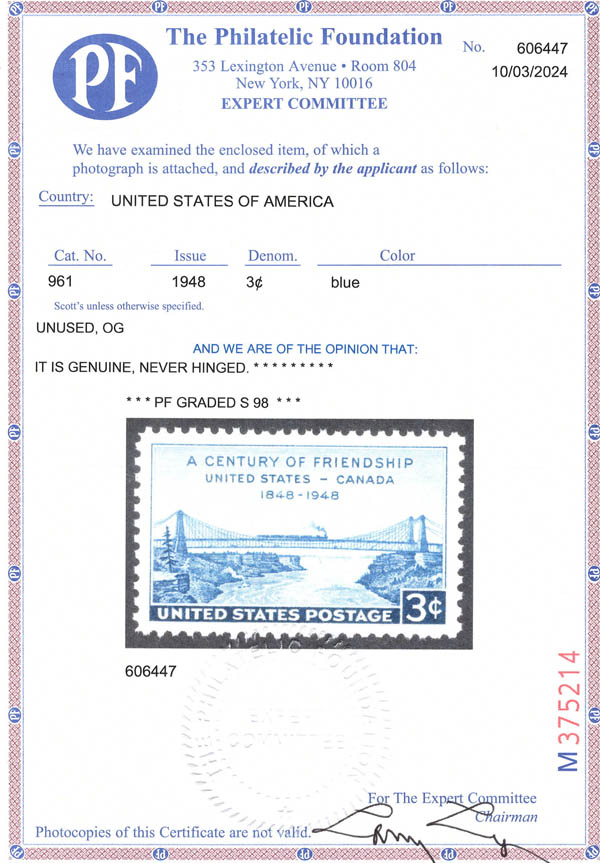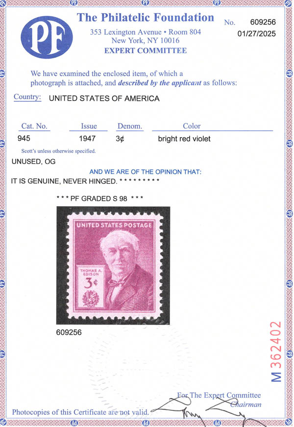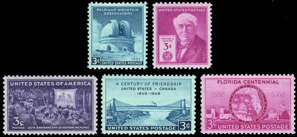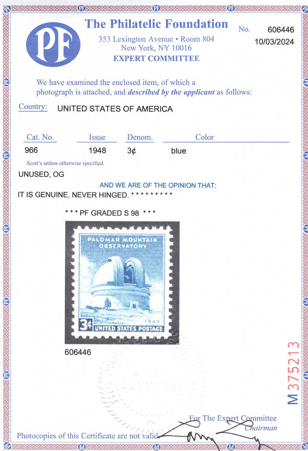 Lot 435![]() ![]() 1944-48, a group of 5 superb graded commemorative stamps (Scott 926, 927, 945, 961, 966), including 1944, 3¢ Motion Pictures; 1945, 3¢ Florida Statehood; 1947 3¢ Thomas Edison; 1948, 3¢ U.S.-Canada Friendship; and 1948, 3¢ Palomar Observatory, o.g., never hinged, Superb, all with 2024-25 P.F. certificate graded SUP 98. SMQ $395. Estimate $180 - 240. |