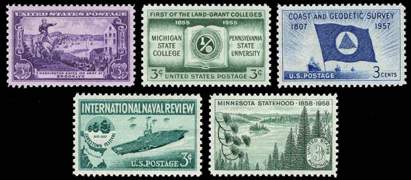 Lot 437![]() ![]() 1951-58, a group of 5 superb graded stamps (Scott 1003, 1065, 1088, 1091, 1106), including 1951, 3¢ Battle of Brooklyn; 1955, 3¢ Land Grant Colleges; 1957, 3¢ Coast & Geodetic Survey; 1957, 3¢ International Naval Review; and 1958, 3¢ Minnesota Statehood, o.g., never hinged, Superb, all with 2024-25 P.F. certificates graded SUP 98. SMQ $335. Estimate $150 - 200. |