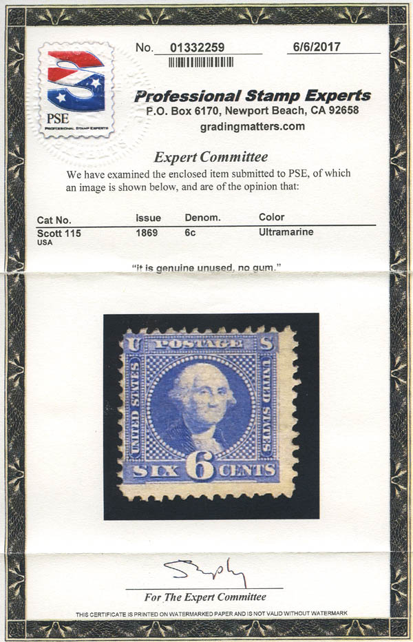 1869, 6¢ Washington, ultramarine (Scott 115), bright fresh color, unused without gum, Very Good, with 2017 P.S.E. certificate. Scott $1,050.