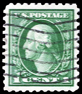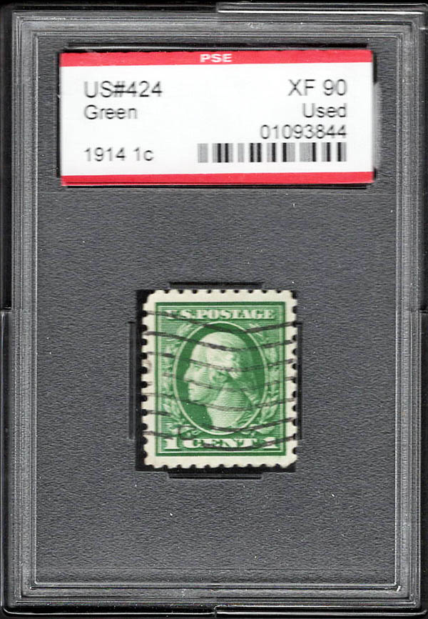 Lot 447 o 1914, 1¢ Washington, green, S.L. watermark, perf 10 (Scott 424), wonderfully well centered, with a neat light cancel, Extremely Fine and choice, with encapsulated P.S.E. certificate graded XF 90. SMQ $35. Estimate $30 - 40. |
