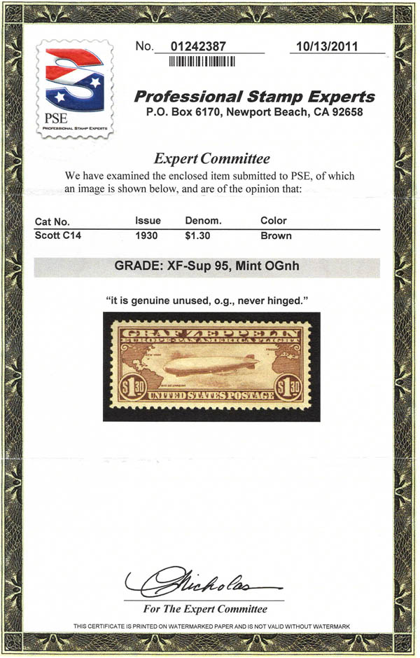 Lot 454![]() ![]() Airmail, 1930, $1.30 Graf Zeppelin (Scott C14), a stunningly choice gem, o.g., never hinged, Extremely Fine to Superb, with 2011 P.S.E. certificate graded XF-SUP 95. Scott $575. SMQ $1,250. Estimate $750 - 1,000. |