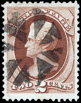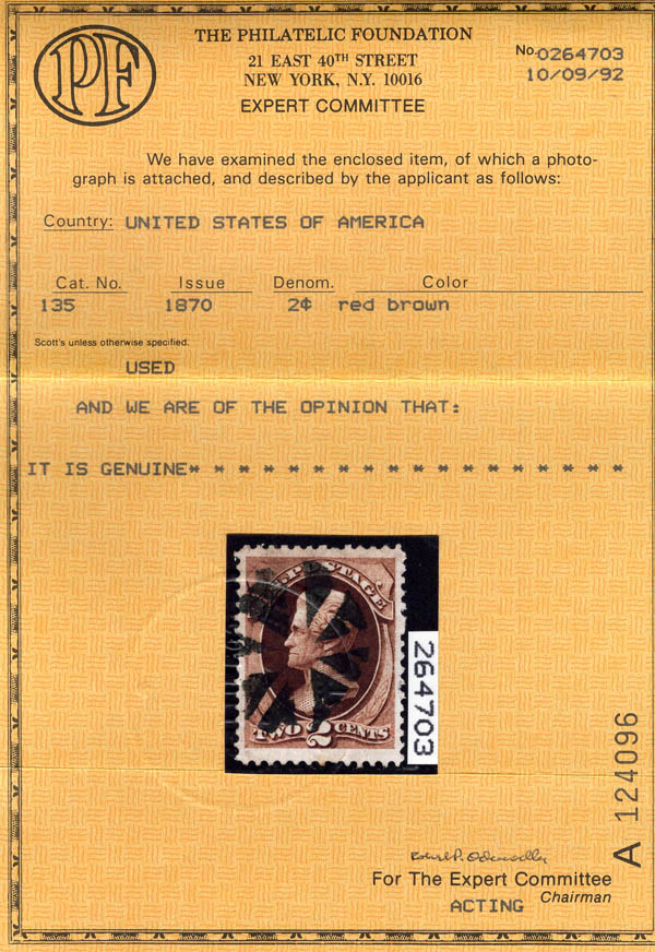 Lot 456 o 1870, 2¢ Jackson, red brown, H. grill, N.B.N.C. printing (Scott 135), wonderfully well centered, with a neat socked-on-the-nose circle-of-wedges cancel, Very Fine to Extremely Fine, with 1992 P.F. certificate. Scott $85. Estimate $100 - 150. |