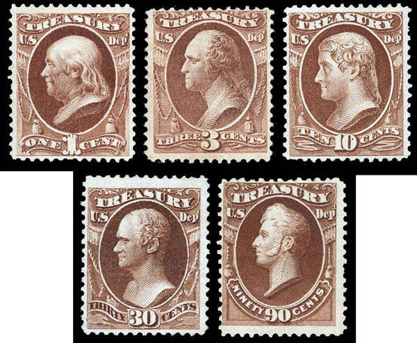 Treasury Dept., 1873, 1¢, 3¢, 10¢, 30¢ and 90¢ (Scott O72, O74, O77, O81, O82), group of 5, all expertly regummed, Fine to Very Fine. Scott $1,345.