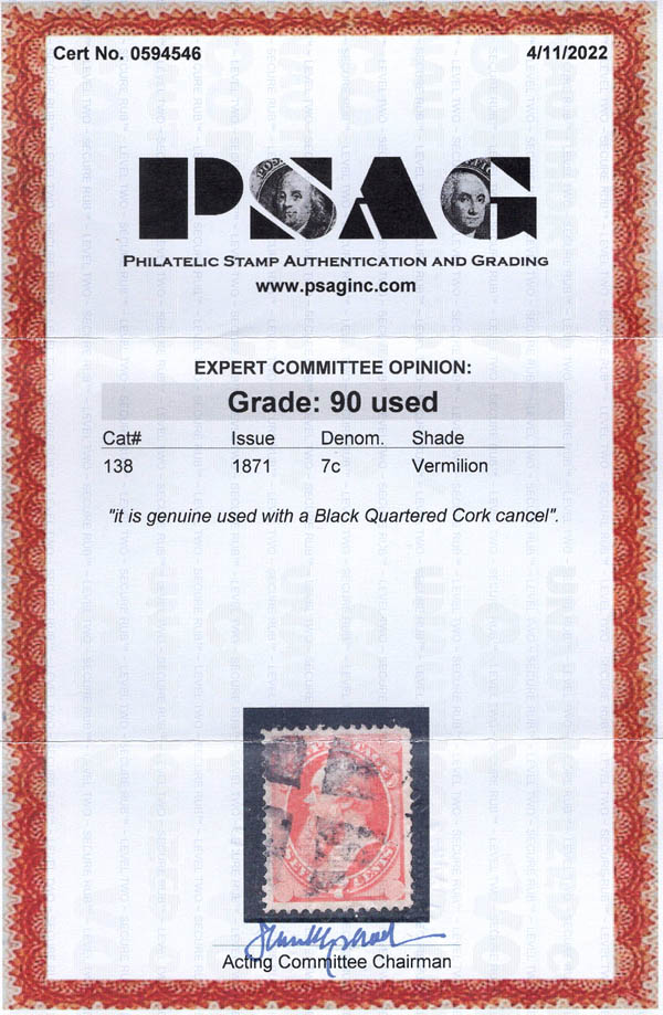 Lot 457 o 1871, 7¢ Stanton, vermilion, H. grill, N.B.N.C. printing (Scott 138), quartered cork cancel, Extremely Fine, with 2022 P.S.A.G. certificate graded XF 90. Scott $525. SMQ $1,100. Scott Stamp Values $1,000. Estimate $600 - 800. |