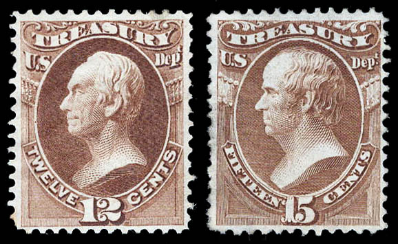 Treasury Dept., 1873, 12¢ and 15¢ brown (Scott O79), both with large part o.g., some gum soaked perfs, otherwise Fine to Very Fine. Scott $650.