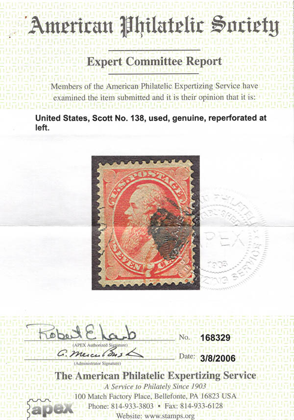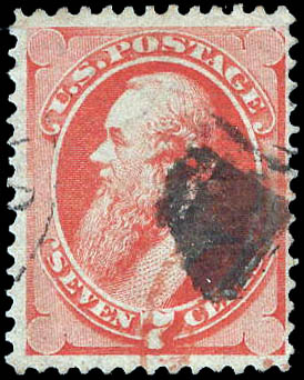 1871, 7¢ Stanton, vermilion, H. grill, N.B.N.C. printing (Scott 138), red and black cancels; reperfed at left, Fine appearance, with 2006 A.P.S. certificate. Scott $525.