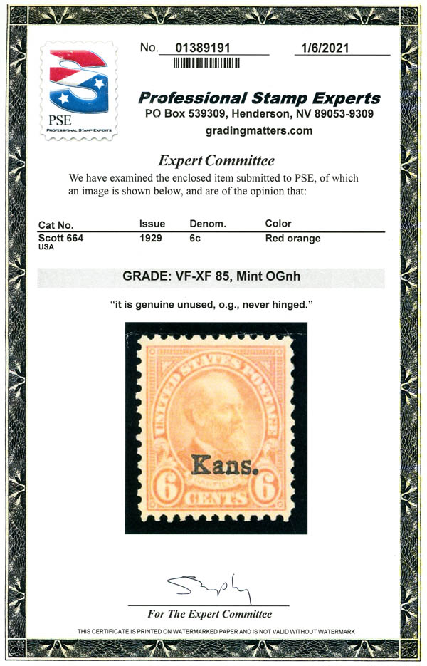 1929, 6¢ Kans. (Scott 664), o.g., never hinged, Very Fine to Extremely Fine, with 2021 P.S.E. certificate graded VF-XF 85. SMQ $75.