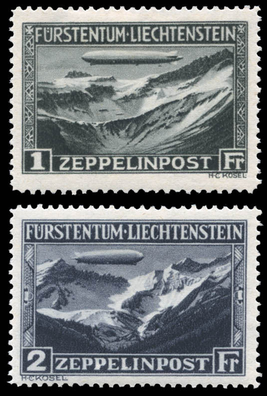 Liechtenstein, Airmail, 1931, Zeppelins, 1fr to 2fr complete (Scott C7-C8), o.g., 1fr with hinge remnant, 2fr lightly hinged, Very Fine. Scott $210. Michel 114-115. Zumstein 7-8.