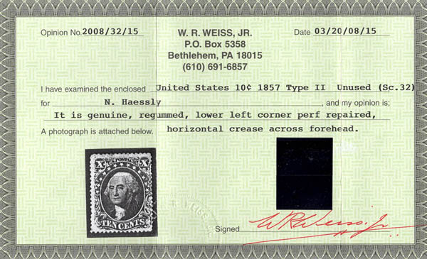 Lot 46 ( )1857, 10¢ Washington, green, type II (Scott 32), regummed; lower left corner repaired and horizontal crease across forehead, otherwise nearly Fine, with 2015 Weiss certificate. Scott $2,000. Estimate $300 - 400. |
