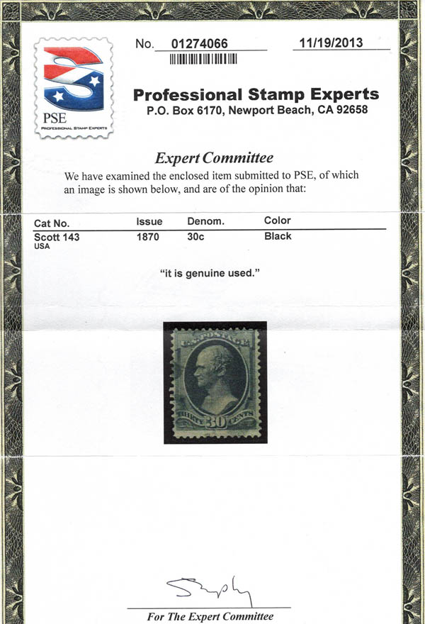 1870, 30¢ Hamilton, black, H. grill, N.B.N.C. printing (Scott 143), lightly canceled, about Fine, with 2013 P.S.E. certificate. Scott $4,000.