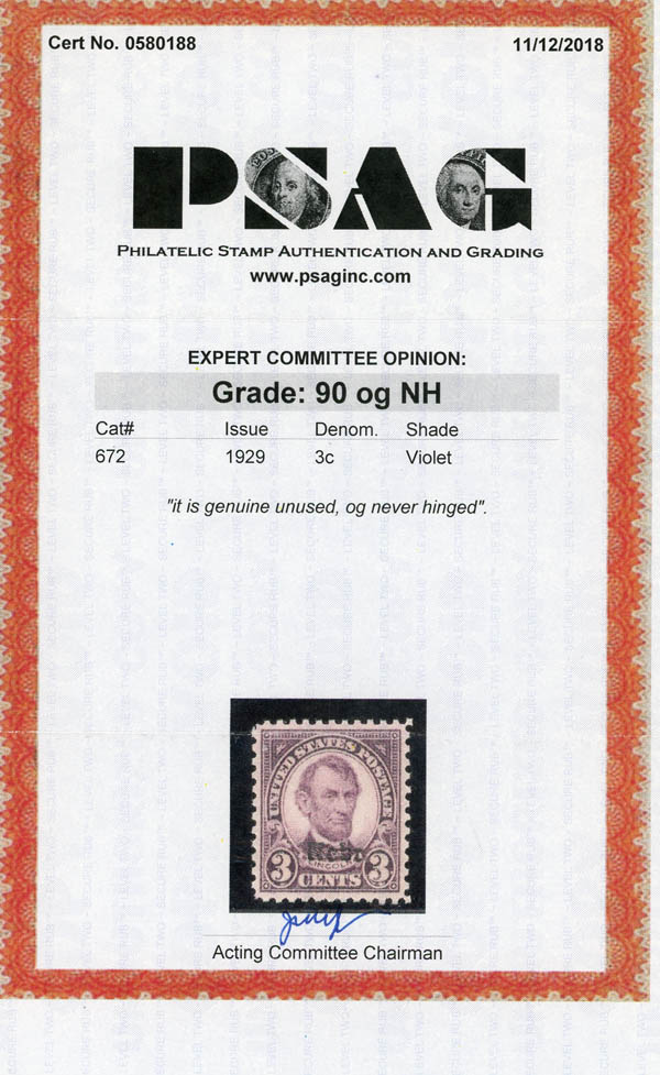 1929, 3¢ Nebr. (Scott 672), o.g., never hinged, Extremely Fine, with 2018 P.S.A.G. certificate graded XF 90. SMQ $50.