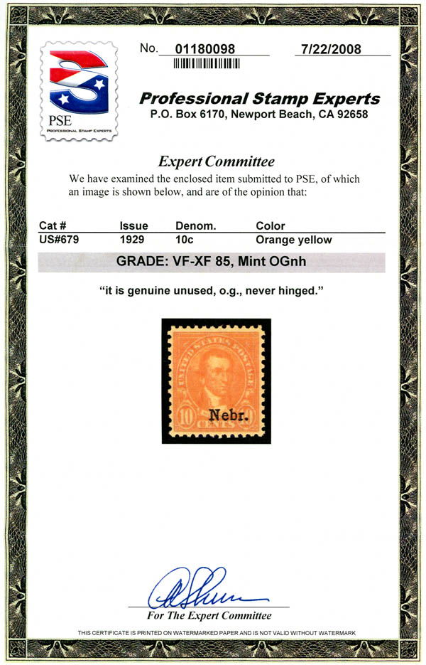 1929, 10¢ Nebr. (Scott 679), o.g., never hinged, Very Fine to Extremely Fine, with 2008 P.S.E. certificate graded VF-XF 85. SMQ $165.