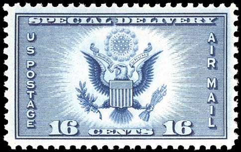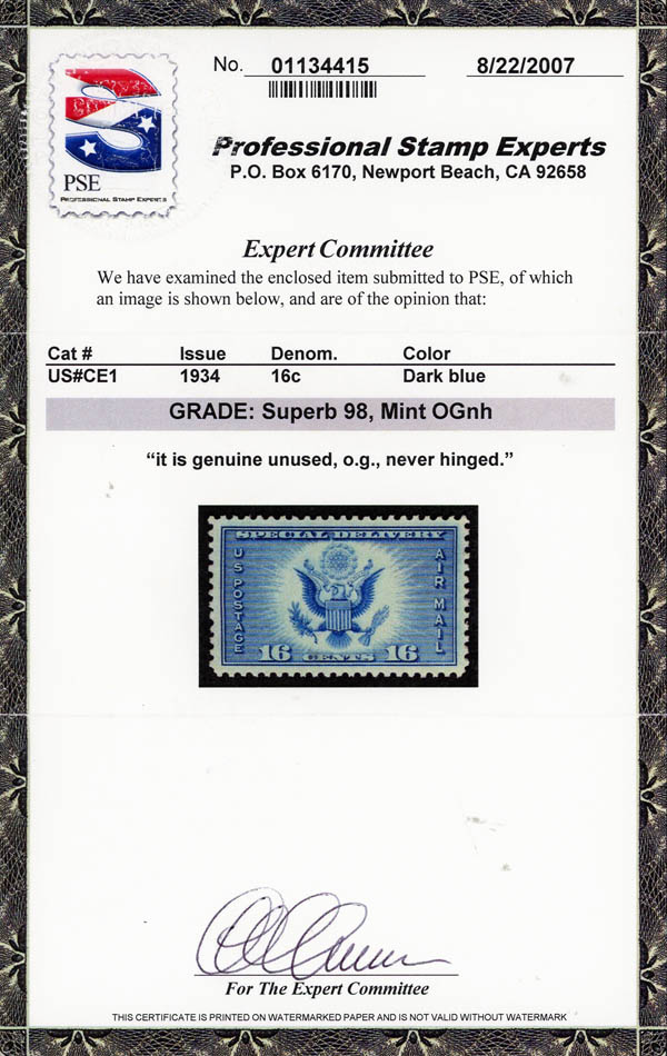 Airmail Special Delivery, 1934, 16¢ dark blue (Scott CE1), o.g., never hinged, Superb, with 2007 P.S.E. certificate graded SUP 98. SMQ $100.