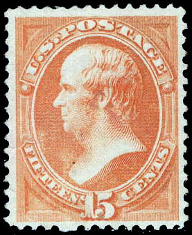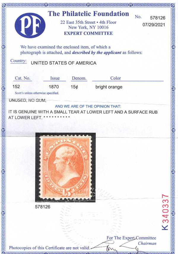 Lot 467 ( )1870, 15¢ Webster, bright orange, without grill, N.B.N.C. printing (Scott 152), beautifully well centered, unused without gum; a small tear and surface rub at lower left, otherwise Very Fine, with 2021 P.F. certificate. Scott $1,300. Estimate $500 - 750. |