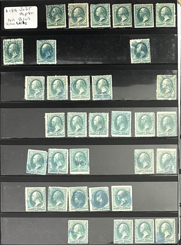 Lot 474 o 1873-79, 3¢ Washington, green, a massive group (Scott 158, 184, 207), CBNC and ABNC printings, an interesting study and compilation with various cancels including blue ones, over 1000 stamps here, a few with jumbo margins and very attractive centering, generally Fine to Very Fine, we have only imaged one page to give a flavor of the lot. Scott approximately $1,000. Estimate $150 - 200. |