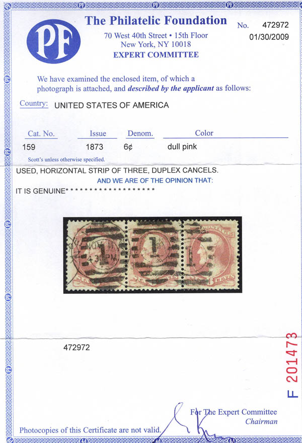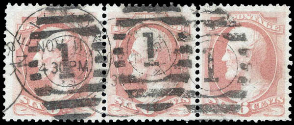Lot 475 o 1873, 6¢ Lincoln, dull pink, C.B.N.C. printing (Scott 159), strip of 3, an impressive multiple, with neat New York duplex cancels, Very Fine to Extremely Fine, with 2009 P.F. certificate. Scott $56. Estimate $80 - 120. |