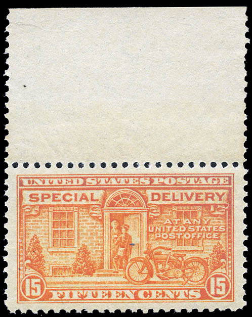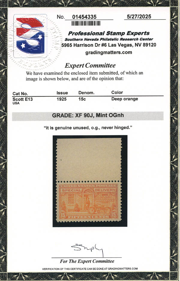 Special Delivery, 1925, 15¢ deep orange (Scott E13), o.g., never hinged, Extremely Fine, with 2025 P.S.E. certificate graded XF 90J. Scott $75. SMQ $140.