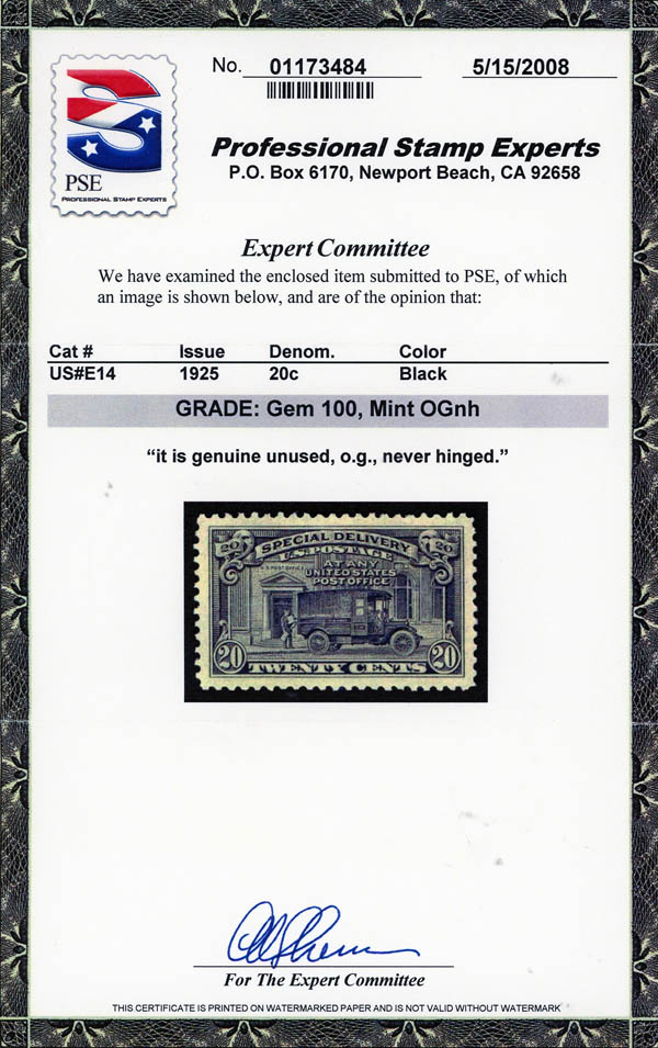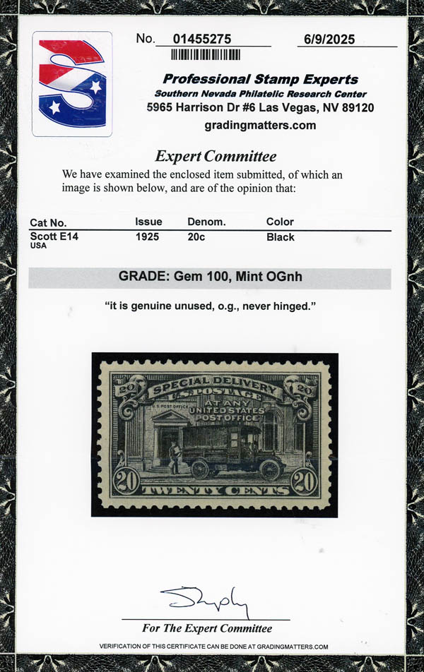 Lot 477![]() ![]() Special Delivery, 1925, 20¢ black (Scott E14), precision centering and intense shade, a stunning gem! o.g., never hinged, Superb, with 2025 and 2008 P.S.E. certificate graded GEM 100, only 2 with this grade and only 2 with a higher grade in P.S.E.'s Population Report. SMQ $500. Estimate $500 - 750. |