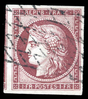 Lot 48 o France, 1849, Ceres, 1fr light carmine (Scott 9. Yvert 6a), a gem example with large to huge margins all around including parts of the next stamp at left, neat endless grill cancel, Extremely Fine to Superb, rarely seen this nice. Scott $650. Yvert €1,300 ($1,270). Estimate $250 - 350. |