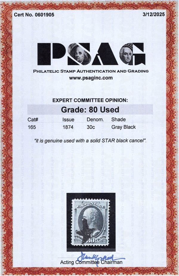 Lot 480 o 1873, 30¢ Hamilton, gray black, C.B.N.C. printing (Scott 165), well centered, with a neat solid star cancel, Very Fine, with 2025 P.S.A.G. certificate graded VF 80. Scott $150. SMQ $150. Scott Stamp Values $150. Estimate $100 - 150. |