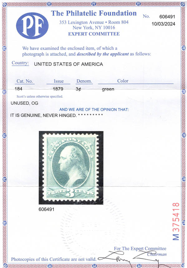 1879, 3¢ Washington, green, A.B.N.C. printing (Scott 184), o.g., never hinged, Very Fine, with 2024 P.F. certificate. Scott $325.
