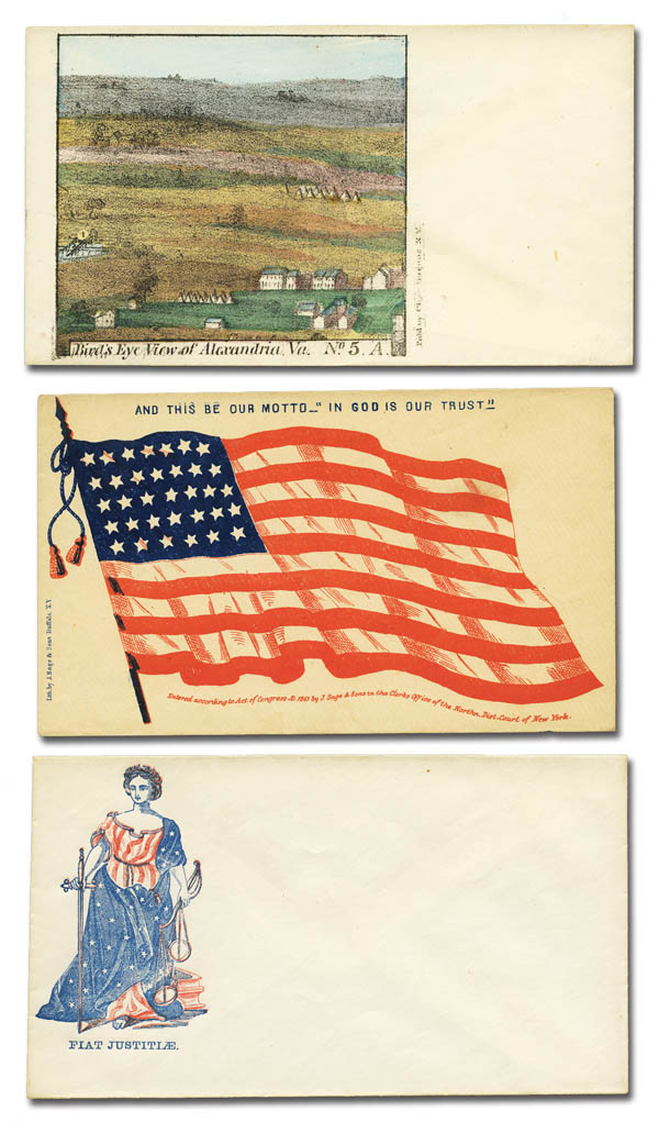 Lot 49![]() ![]() c. 1861, Civil War patriotic covers, a choice selection of 20 different unused designs, including several better, including a hand colored Magnus design, clever caricatures, black Americana, secession balloon and more, all in uniform Very Fine to Extremely Fine condition, unusual to find such a group in top condition. Estimate $250 - 350. |