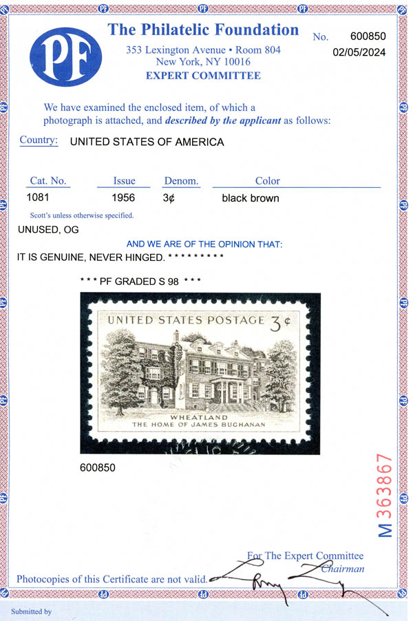 1956, 3¢ Wheatland (Scott 1081), o.g., never hinged, Superb, with 2024 P.F. certificate graded SUP 98. SMQ $60.