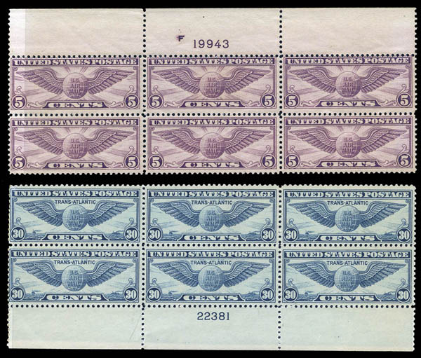 Lot 497![]() ![]() ![]() Airmail, 1930-39, 5¢ Winged Globe (flat plate printing), also China Clipper complete and 30¢ Transatlantic (Scott C12, C20-C22, C24), a group of 5 different plate blocks of 6, o.g., never hinged, Fine to Very Fine. Scott $480. Estimate $150 - 200. |