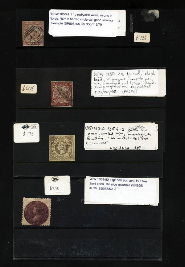 Lot 5![]() Australia & States, 1850-1956, dealer's stock of better issues, neatly arranged and identified on black retail cards, including New South Wales ($1,925), with #1 (used, 3½ margins, $725), #2e (used, 4 margins, $675), #28a (used, 3½ margins, $175), #44 (o.g., hinge remnant, Fine, $350); Queensland ($6,467), with #1 (used, 4 margins, tiny thin, $1,050), #2 (used, 3½ margins, tiny rub, $2,250), #4 (mint, o.g., V.G., $2,750); South Australia ($2,000), with #8 (used, 4 margins, $200), #9 (used, 3 margins, faults, $500) and 4 proofs; Tasmania ($1,240), with #4 (used, 3½ margins, $1,000), #86-93 (mint, o.g., $240); Victoria ($275); Western Australia ($3,430), with #1 (x3 used, 3½ margins or 3 margins, $275 each), #3 (x2 used, 3 margins, $275 each), #4 (used, 4 margins, $900), #16 (used, 3 margins, tiny thin, $875); Australia ($926). Condition tends to be typical of the period: V.G.-Fine for 19th century, F.-V.F. for 20th century. There are occasional small faults in the 19th century issues. Many very scarce and very salable stamps here at a very reasonable price - all are imaged on the web. Scott $15,263. Estimate $1,000 - 1,500. |