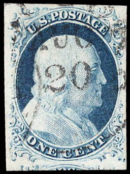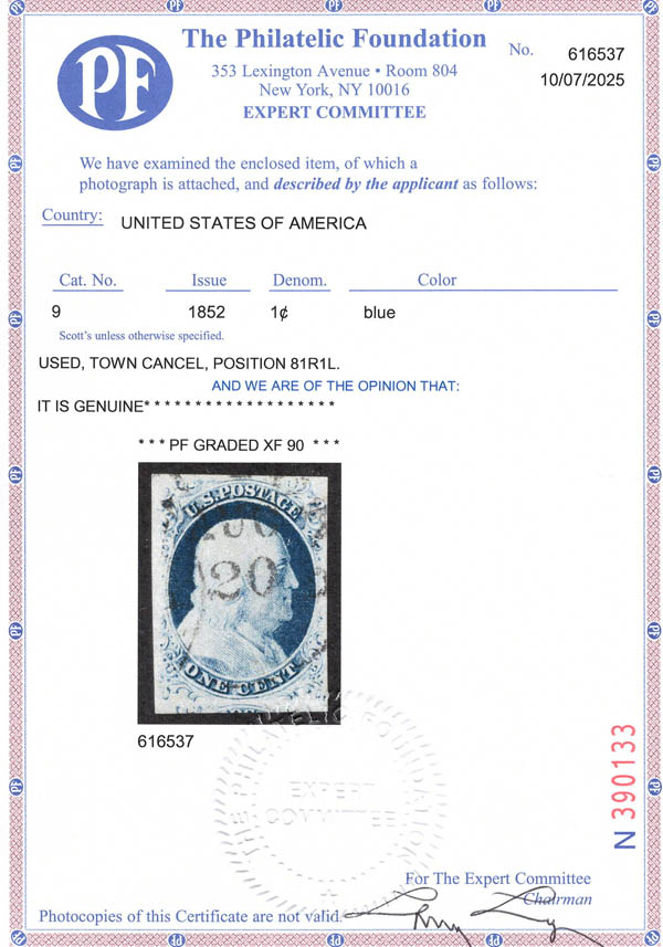 Lot 5 o 1852, 1¢ Franklin, blue, type IV (Scott 9), position 81R1L, huge margins on all sides, even showing part of the adjacent stamp at bottom, town cancel, Extremely Fine, with 2000 and 2025 P.F. certificates, the latter graded XF 90, a narrow-margined issue that is rarely seen so nice. Scott $100. Scott Stamp Values $275. Estimate $150 - 200. |